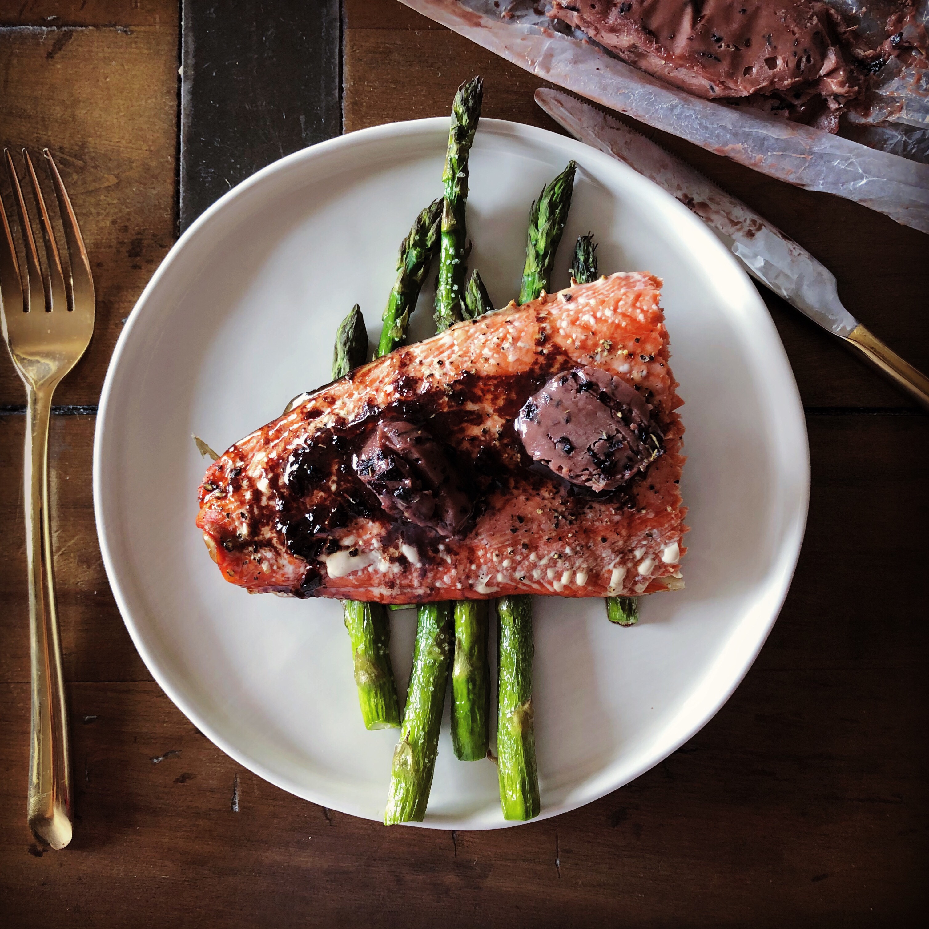 - Grill or pan-fry the fish, and serve the fish on top a bed of asparagus spears. Top the salmon with a slice of red wine butter.