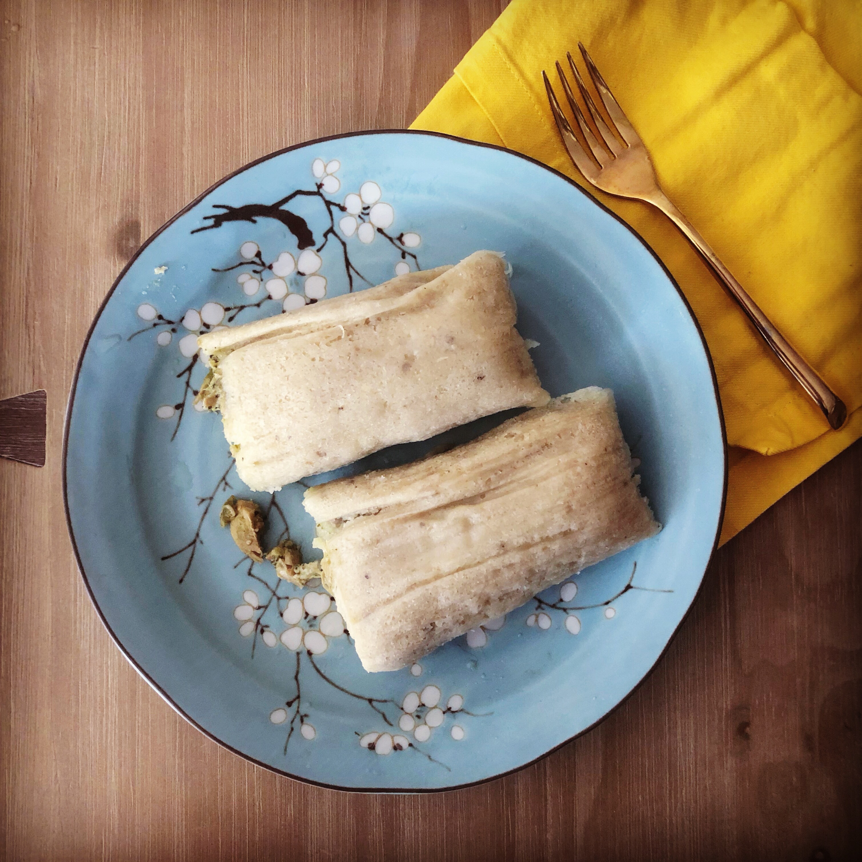- Now it’s time to start assembling. When choosing a corn husk, you need a corn husk that’s wide enough to be able to spread a sizable amount of masa on. Some corn husks are naturally more narrow. If you cannot find a corn husk that’s wide enough, you need to put two corn husks together. We have found that it’s easiest to use your hands when spreading the masa on the corn husk. Last time we tried using the back of the spoon and had lots of problems. You want the masa to be spread wide enough so that when you roll the corn husk the ends of the masa meet in the middle. There also needs to be enough space at the top of the corn husk because after rolling it, you fold the flap over.