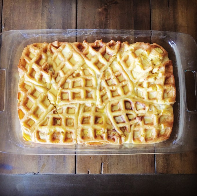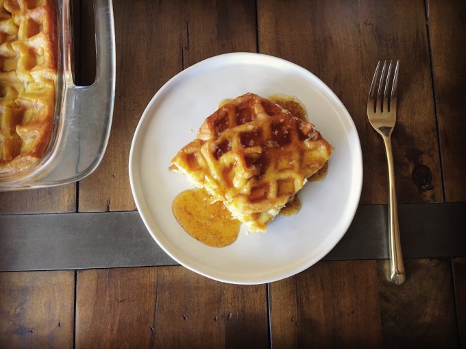 A few months ago I bought two gallons of milk (it was on sale, I was using it for a recipe) in one sitting, and after using the two cups I needed for the recipe; I had a lot of milk left over. So I decided to make waffles and freeze them for an easy breakfast. After a few hours of toiling in the kitchen, I probably made somewhere between 16 and 20 waffles. What I found when reheating them (using the toaster) was that they just weren’t as good as when they first come out of the waffle iron. So I thought about what I could do with all of the frozen waffles in my freezer and came up with this idea: reheat them into French toast waffles. I love waffles, and I love French toast. So I figured the combination of the two would be amazing. Maybe I could start a trend; get this new breakfast hybrid on menus all over the world. But first I needed to try it in our kitchen.