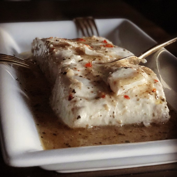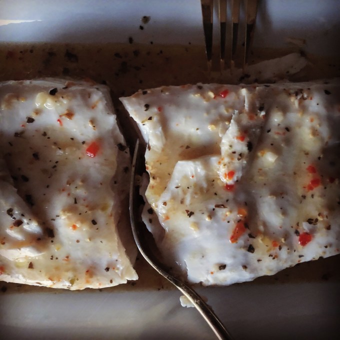 Right now at Costco nary will you find a bag of frozen halibut. Only the fresh stuff. So that’s what we bought today.