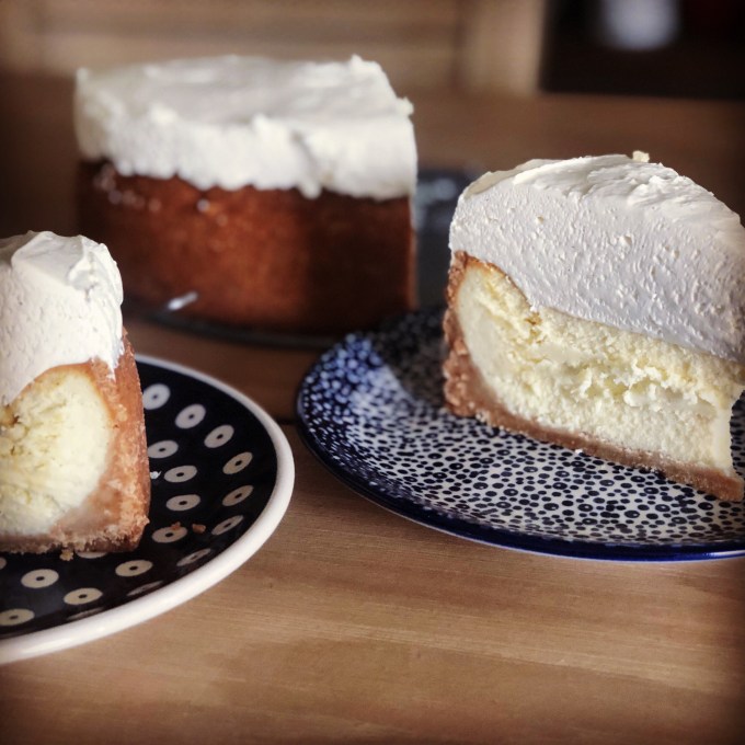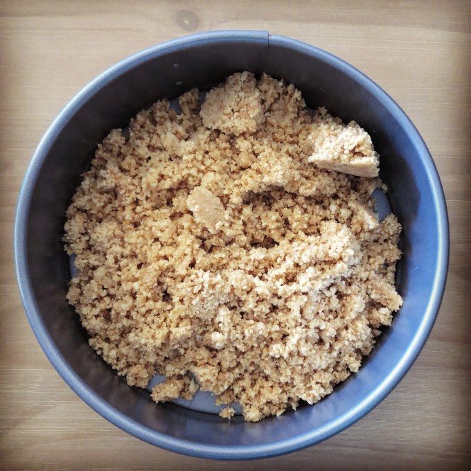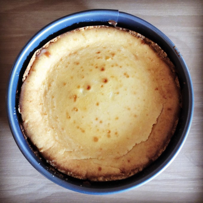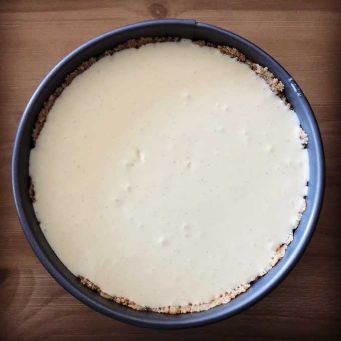 When I recreated this cake I made it a bit differently. I cut the cheesecake base ingredients down a bit because I could barely fit it in the pan last time. The reduced amount worked perfectly. Also the original recipe calls for a crust of 100 Nilla Wafers (crushed) + 1/2 cup butter, melted, mixed together. I didn’t feel like going to the store to buy some cookies so I used what I could find, which was a tin can of shortbread cookies I got for Christmas. It turned out to be a good decision. The smell of the shortbread browning wafted in the air while the cheesecake was baking. It was tantalizing.