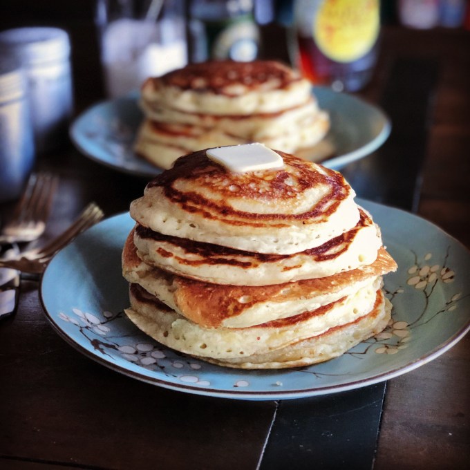 Personally, I like a thicker, fluffier pancake. (If I wanted a thin pancake, I would eat a crepe.) So I tend to add more flour than what is called for in a pancake recipe. For my recipe, I reduced the buttermilk and swapped brown sugar for white sugar; everything else remained the same. The result? A thick delicious melt-in-your-mouth buttermilk pancake. Honestly one of the best pancakes I’ve ever made.