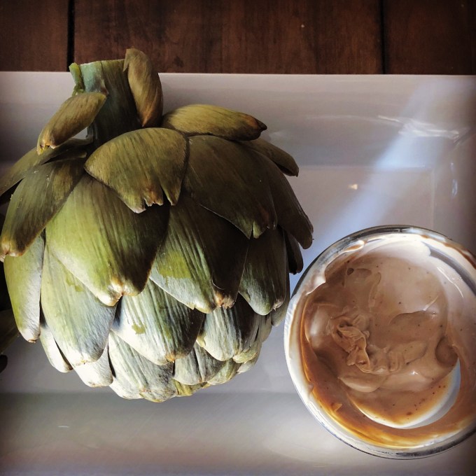 We like to eat our artichoke by dipping the leaves into melted butter seasoned with garlic and salt. I’ve also seen artichoke leaves dipped in balsamic vinaigrette and garlic aoili.