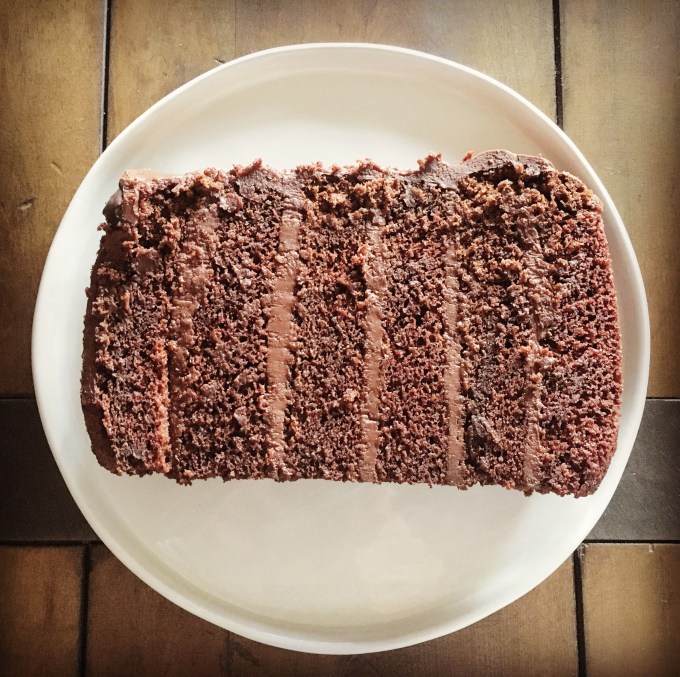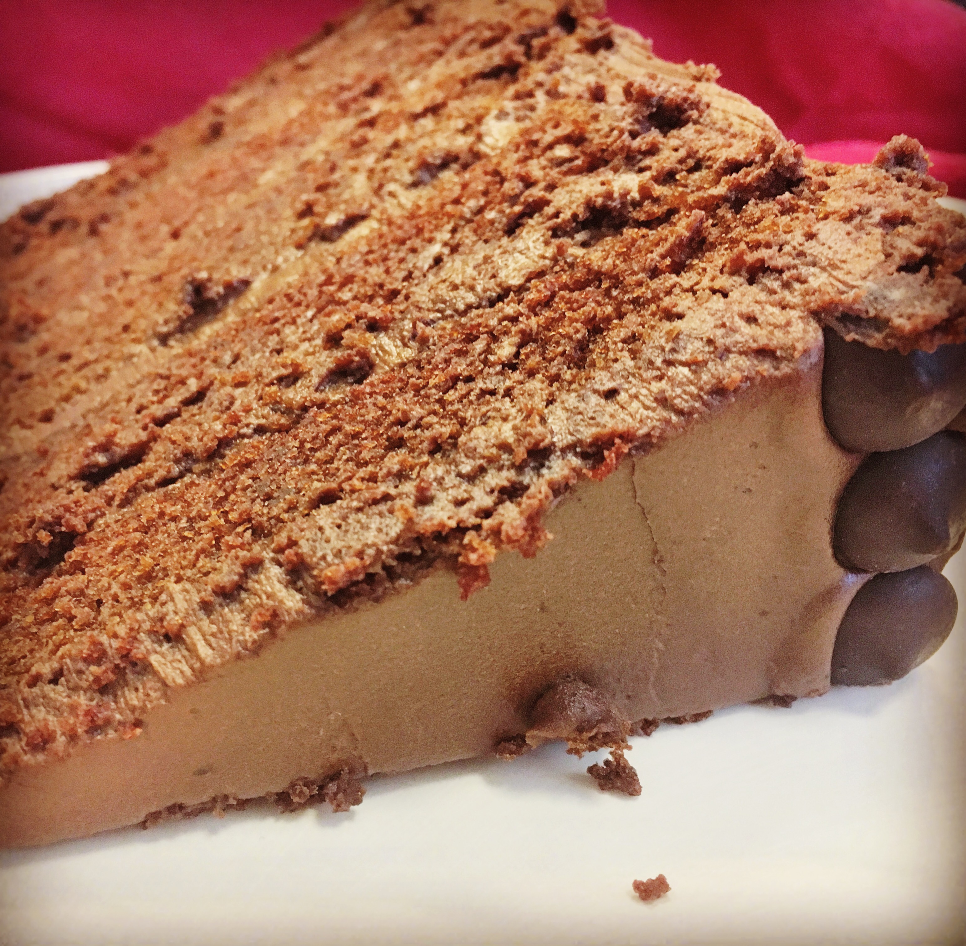 An updated version of an old favorite; six layers of chocolate cake topped with six layers of chocolate icing dotted with chocolate chips.