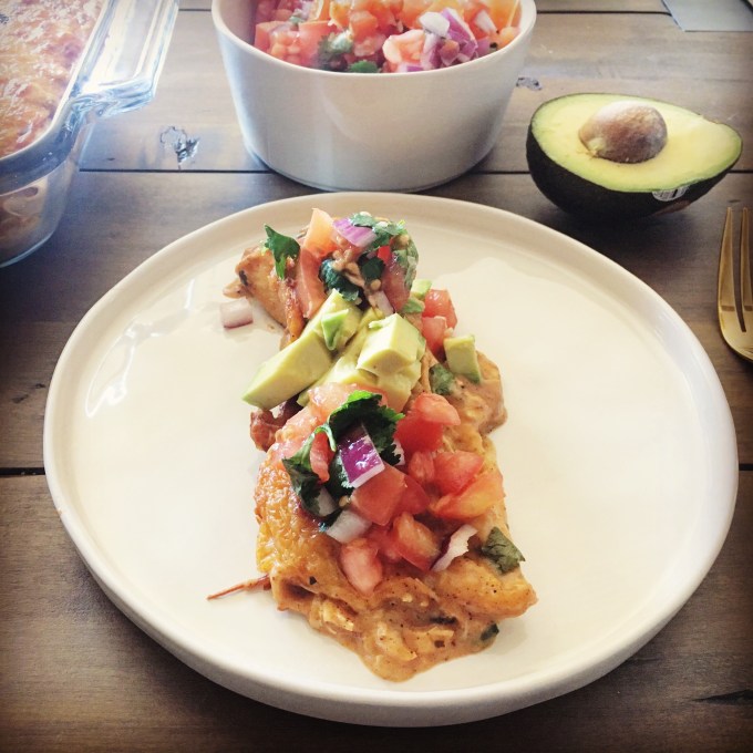 I normally bake this dish in a glass pan. If you’re using a dark nonstick pan like the one we used in the above pictures add five more minutes to the overall cooking time. The beauty part about this dish is you can make it any flavor you want with the kind of salsa you use. My favorite combo is using mild green salsa and spicing it up with a few drops of green Habanero hot sauce. Delish!