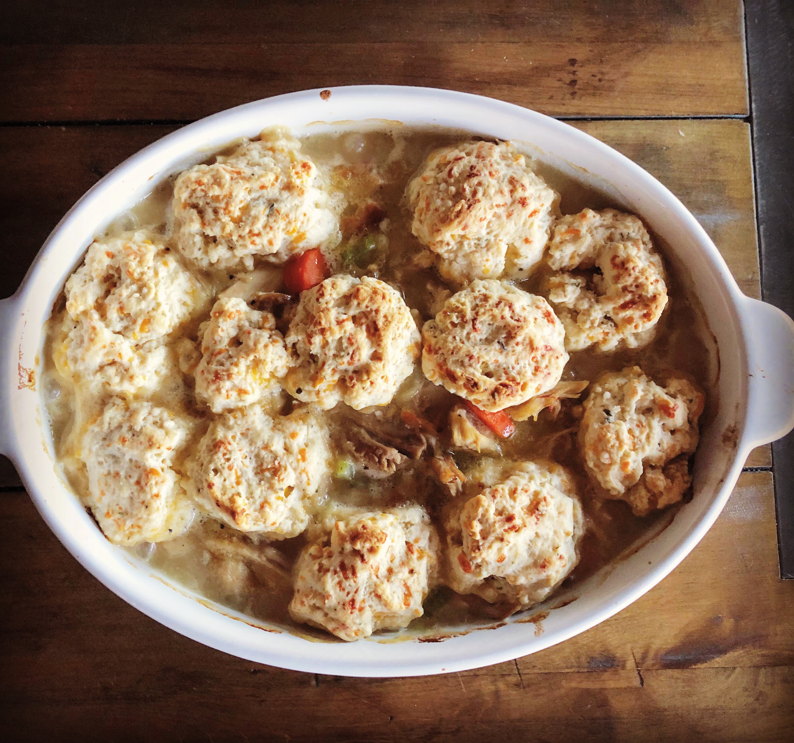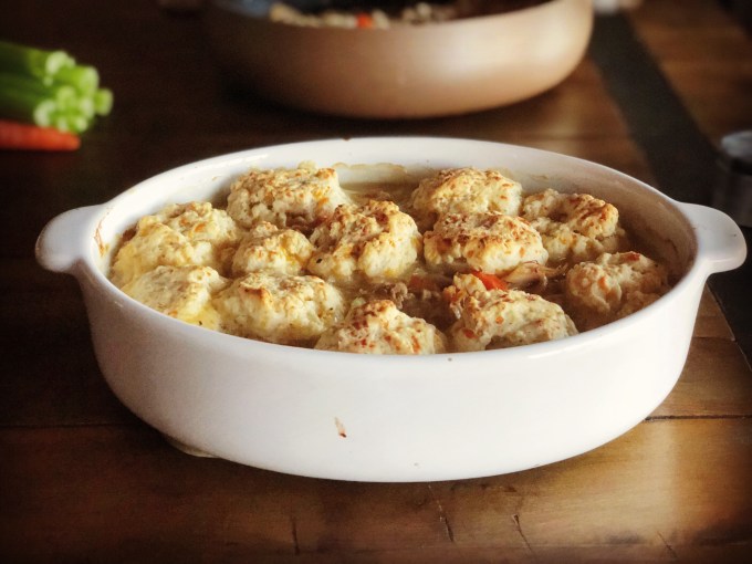 This pot pie was made with turkey stew leftovers and drop biscuits modeled after the ones you get at Red Lobster. (I don’t really like the food at Red Lobster other than the biscuits — those are amazing.) Sis and I had no idea what to do with all the leftover turkey stew from last night, so I suggested making a pot pie. (We had considered using the leftover frozen turkey to make a pot pie last night before we settled on the stew.) I didn’t feel like making pie crust (too time consuming), so I opted for drop biscuits baked on top the stew.