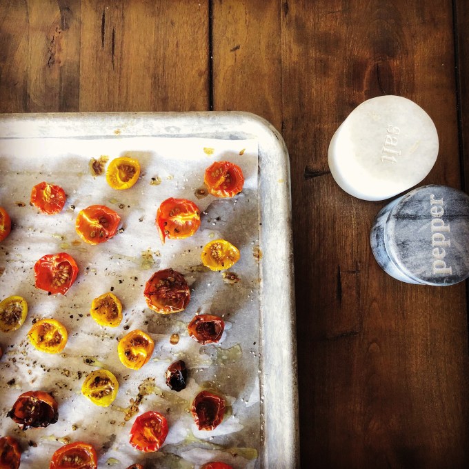 Here’s a lesson in slow-roasting tomatoes: you want to roast them at a low temperature (200 degrees F) for a long time (two hours to four hours). I’ve never roasted tomatoes, but my sister does it all the time. Mainly she uses roasted tomatoes to make pasta sauce but there are tons of other uses for them including topping for chicken or cream cheese schmeared bagels. They also taste great when used to make bruschetta or alone.
