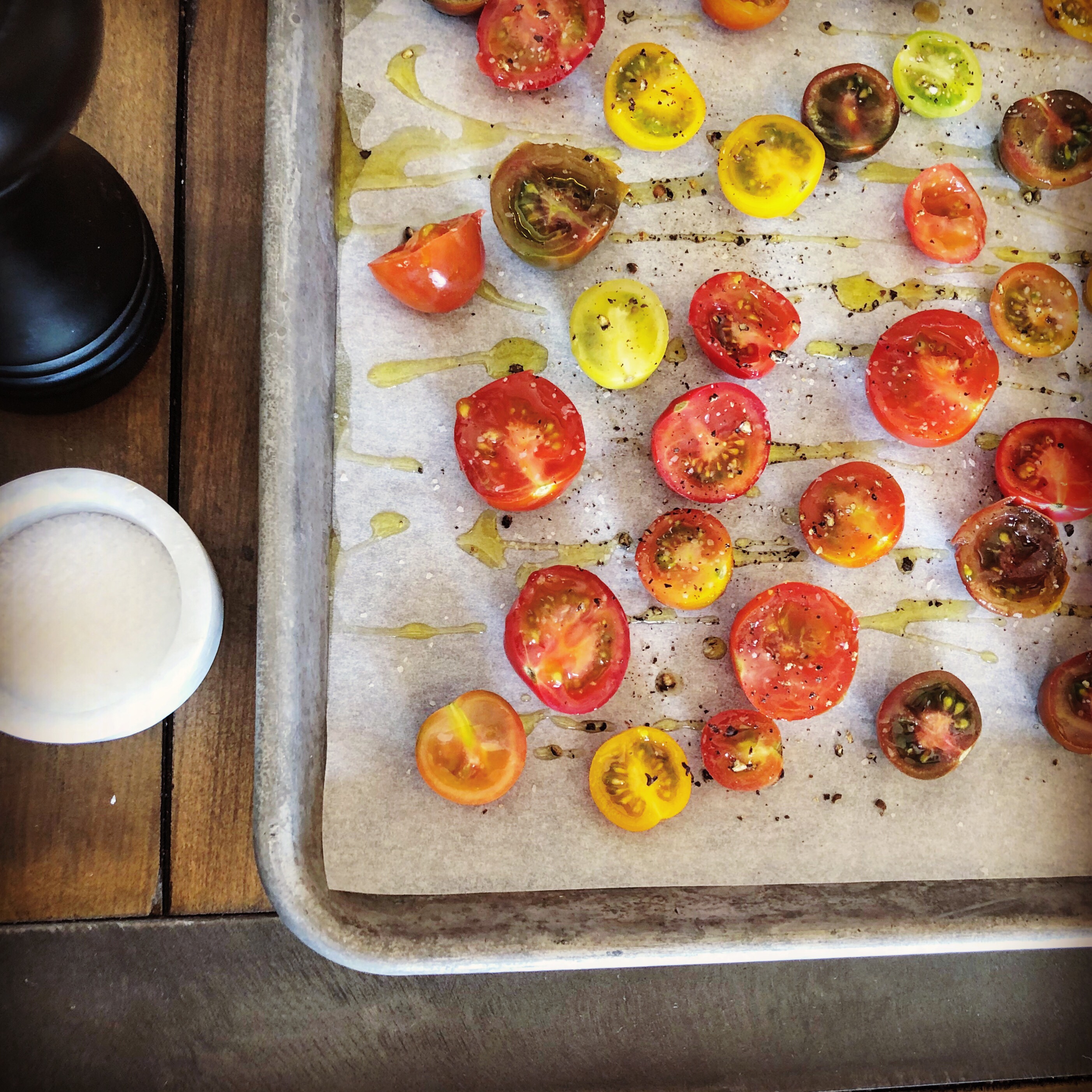 Slice tomatoes in half and place sliced open side up on a cookie sheet lined with parchment paper. Bake for at least two hours (four is preferable if you have the time) at 200 degrees F (if you don’t have four hours turn the oven up to 250 degrees F). You know the tomatoes are done when they start to sink or cave in the middle.