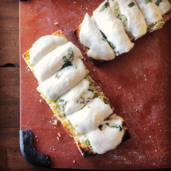 After two glasses of wine a genius idea popped into my head: garlic bread. Even better: cheesy garlic bread (there was fresh mozzarella in the fridge that was calling my name). Because I didn’t want to slather the ciabatta roll with butter, I decided pesto would be the perfect substitute. And thus my invention was born:
