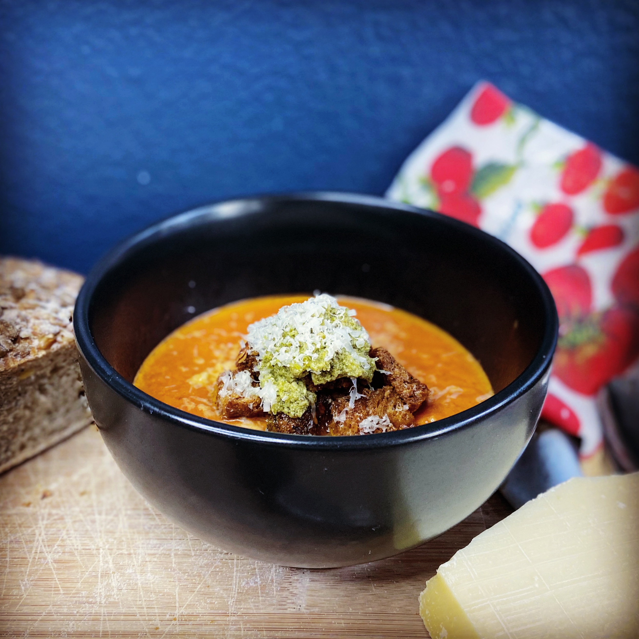 Add all ingredients except for the half & half to a medium-sized sauce pan and simmer for 30 minutes. Add half & half. Using a hand-held blender or food processor, roughly blend the soup. Soup should be somewhat chunky. Sprinkle with parmesan cheese and drizzle with pesto oil. Serve with crusty bread.