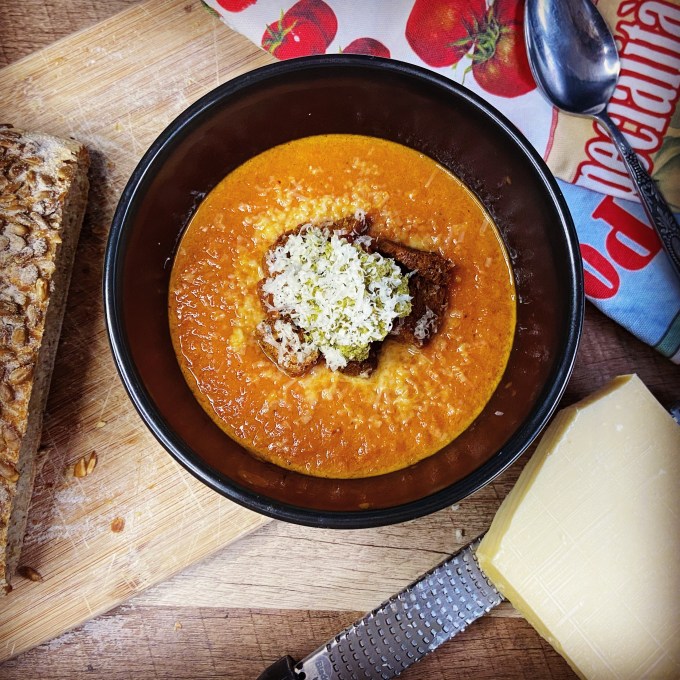 After I returned home from Fred Meyer with some Grand Central Bakery Sourdough Bread, my sister was inspired to whip up this soup so we had something in which to dunk the bread. It took all of two minutes for her to throw the ingredients in the pot; 30 minutes cook-time.