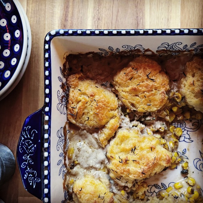 - In a large bowl, combine the flour, baking powder, and the remaining salt. Using 2 knives or your fingertips, add the remaining butter, cut into small pieces. Mix until it resembles crumbs. Stir in the thyme and 1 cup of milk. Drop heaping spoonfuls of the batter on top of the corn mixture. Bake for about 50 minutes. Garnish with fresh thyme, if desired.