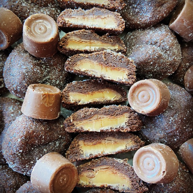 After testing these cookies, I’m most certain I was gypped on Friday at our potluck. There is so much caramel from the Rolo, it’s impossible not to notice the filled center. I made a few with mini Reese’s Peanut Butter cups, too; and those turned out equally as delicious!