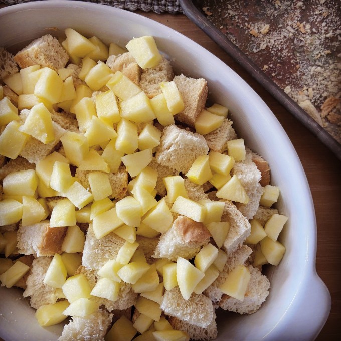 - Place bread cubes and apples in a greased deep casserole dish.