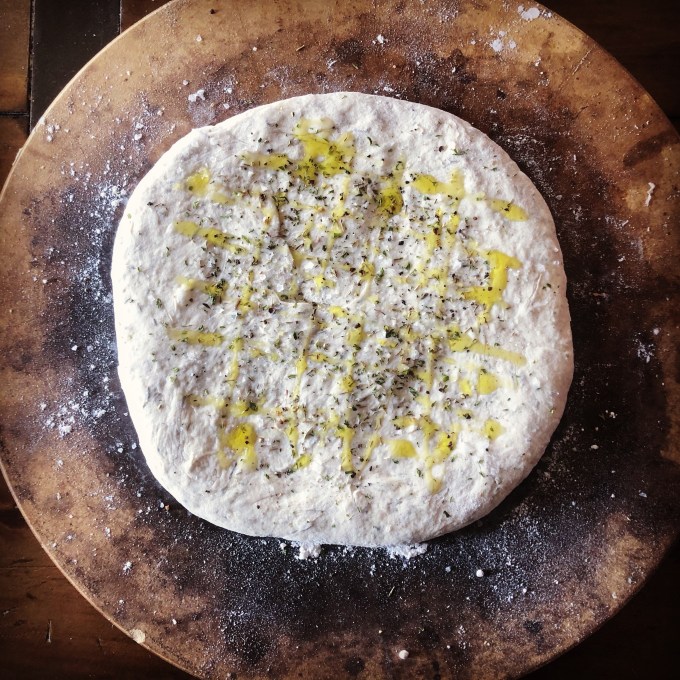 - Sprinkle with rosemary, coarse salt, and freshly ground pepper. Finish with a light drizzle of the remaining olive oil on the surface of the dough. Allow the dough to rest and rise for 20 minutes.