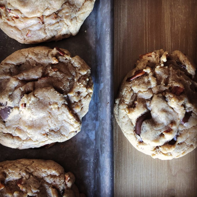 This recipe is adapted from my Bittersweet Chocolate Chip and Toasted Pecan Cookies. The bad news? I was tweaking the recipe hoping for an entirely different result. The good news? These cookies turned out phenomenal. (Especially considering while I was mixing the dough I was texting my friend Max telling him how I didn’t think the cookies would turn out because the texture of the dough seemed weird!)