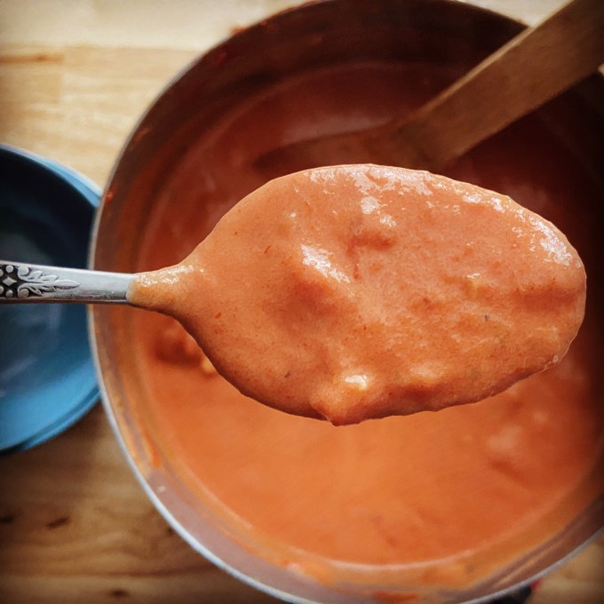 I knew I wanted a creamy marinara sauce on tonight’s Meat and Cheese-Lover’s Pizza but I didn’t know how to get the desired results. I suspected mixing my Easy Marinara Sauce with my Alfredo Sauce would do the trick; however, I didn’t feel much like taking the time to make Alfredo Sauce. (Making a roux can be so cumbersome!) Instead I made this.