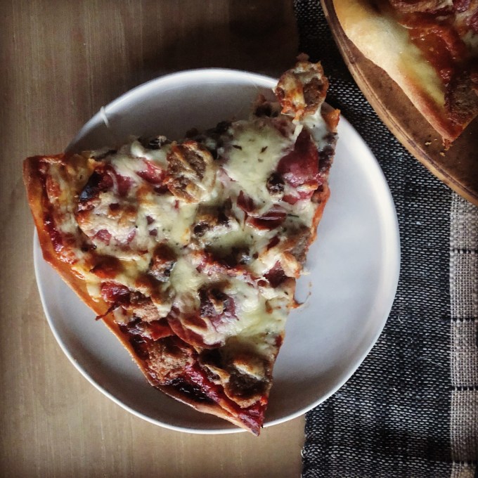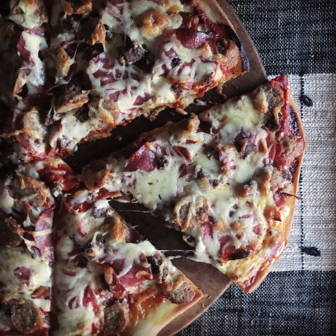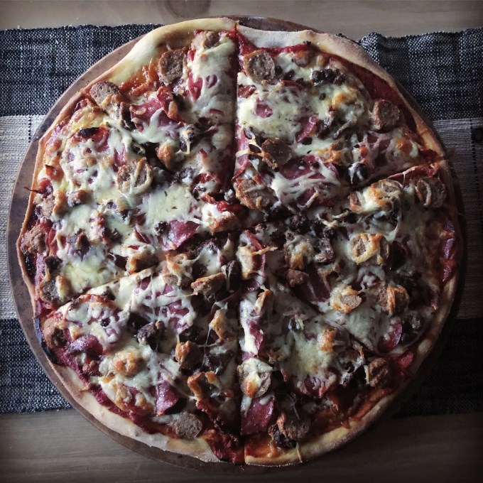 With a half a batch of Garlic and Herb bread dough in the fridge, I decided to try my Meat-Lover’s Calzone as a pizza sans Gorgonzola cheese. The results were even better than I had expected.
