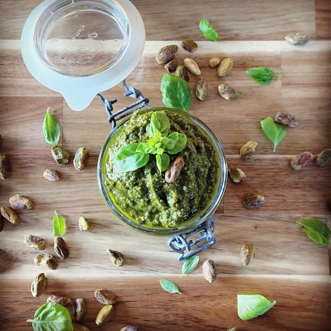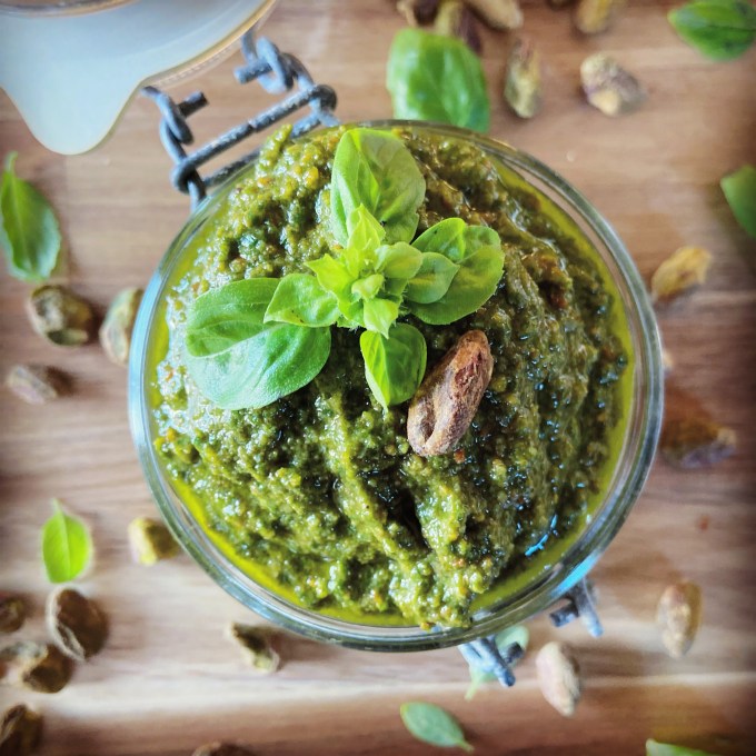 I love this as an alternative to traditional pesto (made with pine nuts) because pistachios don’t change the flavor of the sauce – not that noticeably. Not to me anyway. Bonus: pistachios seem to be considerably cheaper than pine nuts.