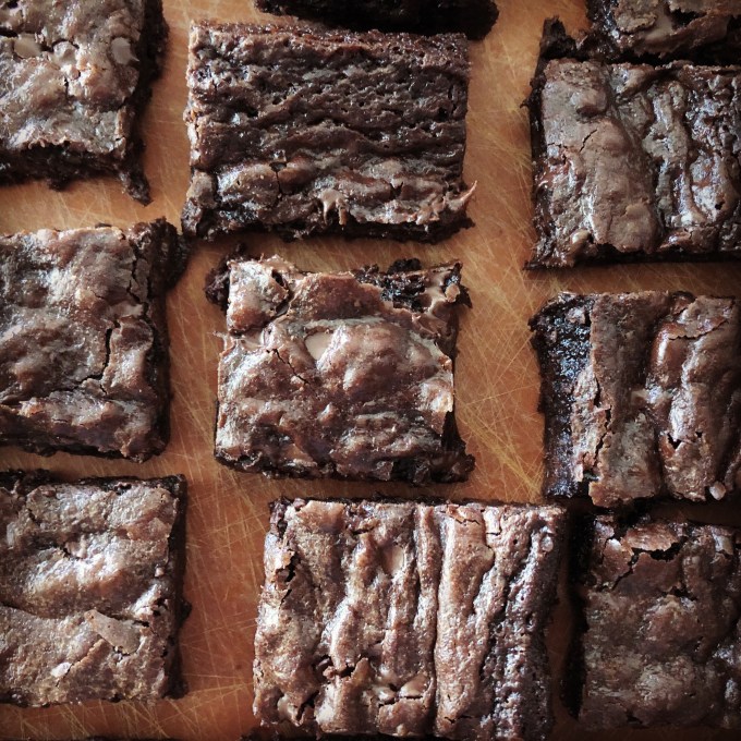 This recipe is a riff on a fudge brownie recipe I just made. Instead of just melting the butter I browned it which gives the brownies a bit of a caramelized texture on the bottom/edges. This is one hell of a brownie. They taste slightly like caramel thanks to the brown butter and the brown sugar. Very rich, moist and fudgy. I bet you can’t eat just one. If you cut them smaller, you won’t feel bad about yourself for eating two or three.