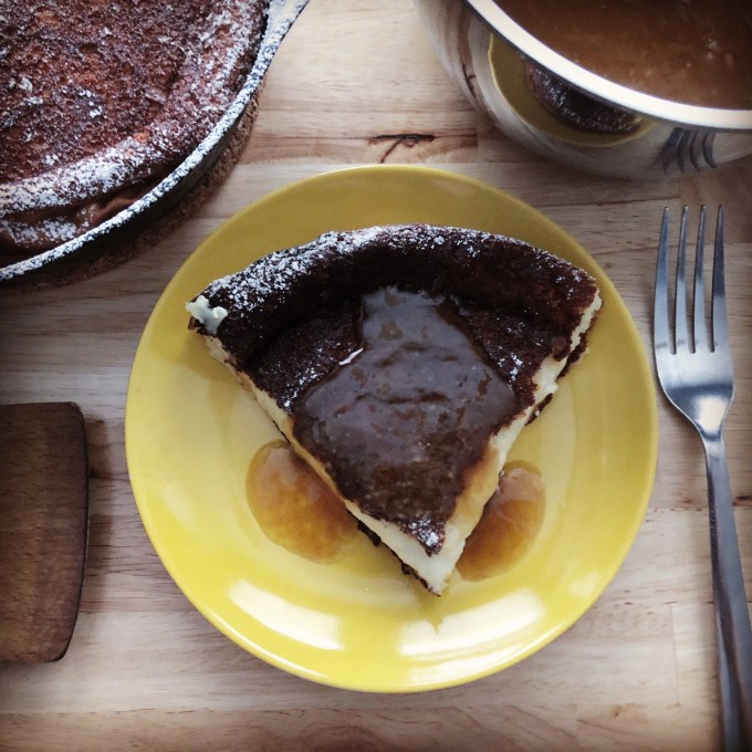 While I was waiting for the pancake to finish, I quickly browned some butter and poured in a bit of honey and a pinch of salt to make a salted honey brown butter sauce that I poured on the pancake before eating. When I made this pancake several years ago I commented on how plain it tasted when I ate it hours later at room temperature. If you don’t like it plain, eat with your favorite pancake toppings. The possibilities are endless!