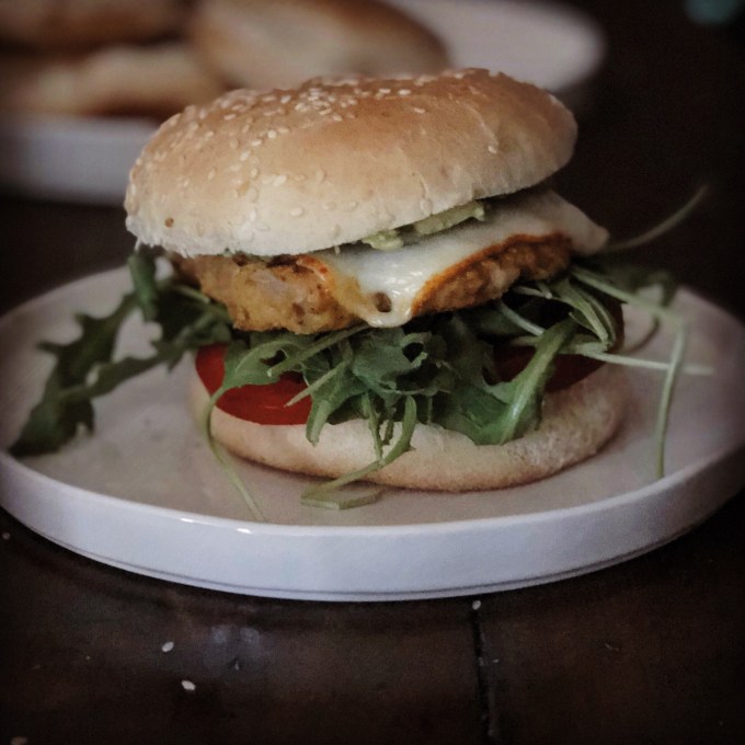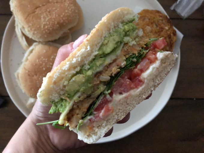 My only complaint about this ‘burger’ is the distinct lemon taste that permeates the burger. I squeezed the juice of one lemon into the beans when pureeing and it seems as though that was too much. However, my vegetarian friend loved the lemon flavor, which just goes to show … to each her own.