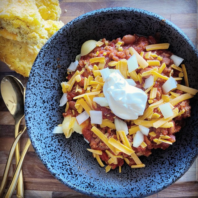 I realized when making this the other day that I was out of chili powder (which I found completely confounding) so I used Ancho Chili powder instead. I can’t tell you I noticed any substantial difference between the pot of chili I made with Ancho Chili powder versus my mom’s classic recipe. I also subbed Lawry’s seasoned salt because I’m low on Himalayan pink salt (which is what I’m using to salt my food these days).