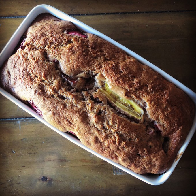 - Scrape the batter into the prepared pan, top with additional sliced strawberries and banana for a pretty garnish, and bake about an hour or until the bread is golden brown and a toothpick inserted in the center comes out clean. Place on a wire rack to cool and then remove the bread from the pan. Serve warm or at room temperature.