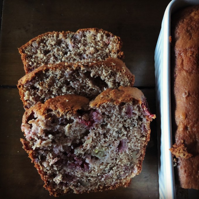 As the bread was baking, strawberry and cinnamon filled the air. With cinnamon permeating the air, I decided I would cut down on the cinnamon if I could go back in time – but that’s because it’s my opinion that strawberry and cinnamon do not mix. As it turns out, I didn’t taste much cinnamon in the finished product.