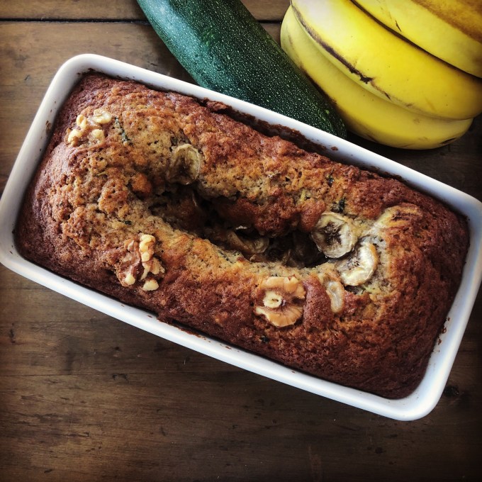 - Mix together zucchini (drained of excess liquid), bananas, sugar, oil and eggs.