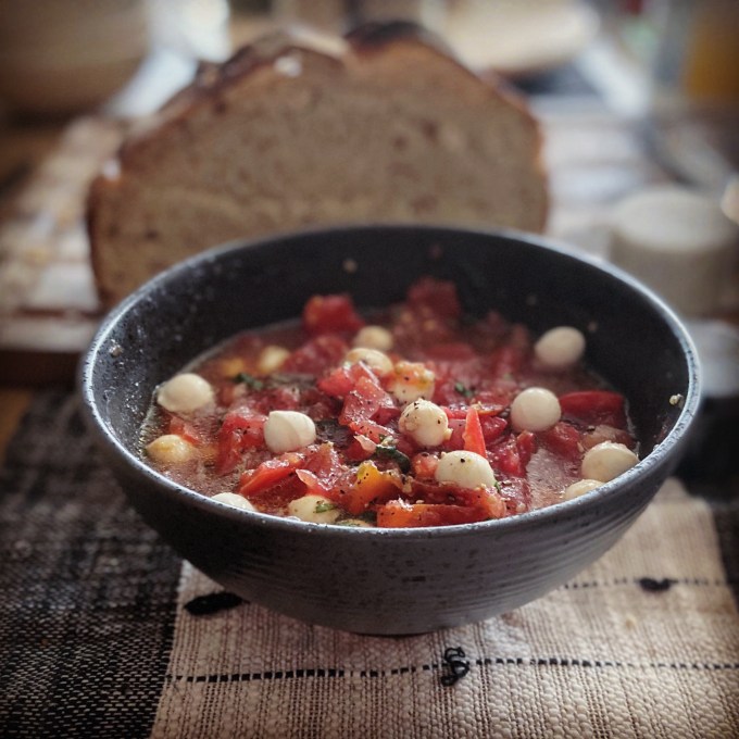 This is easy and fast. Perfect if you’re looking for different kind of appetizer or a light and (somewhat) healthy supper. I used fresh, ripe tomatoes from my sister’s garden. Thanks for the recipe, Grandma!