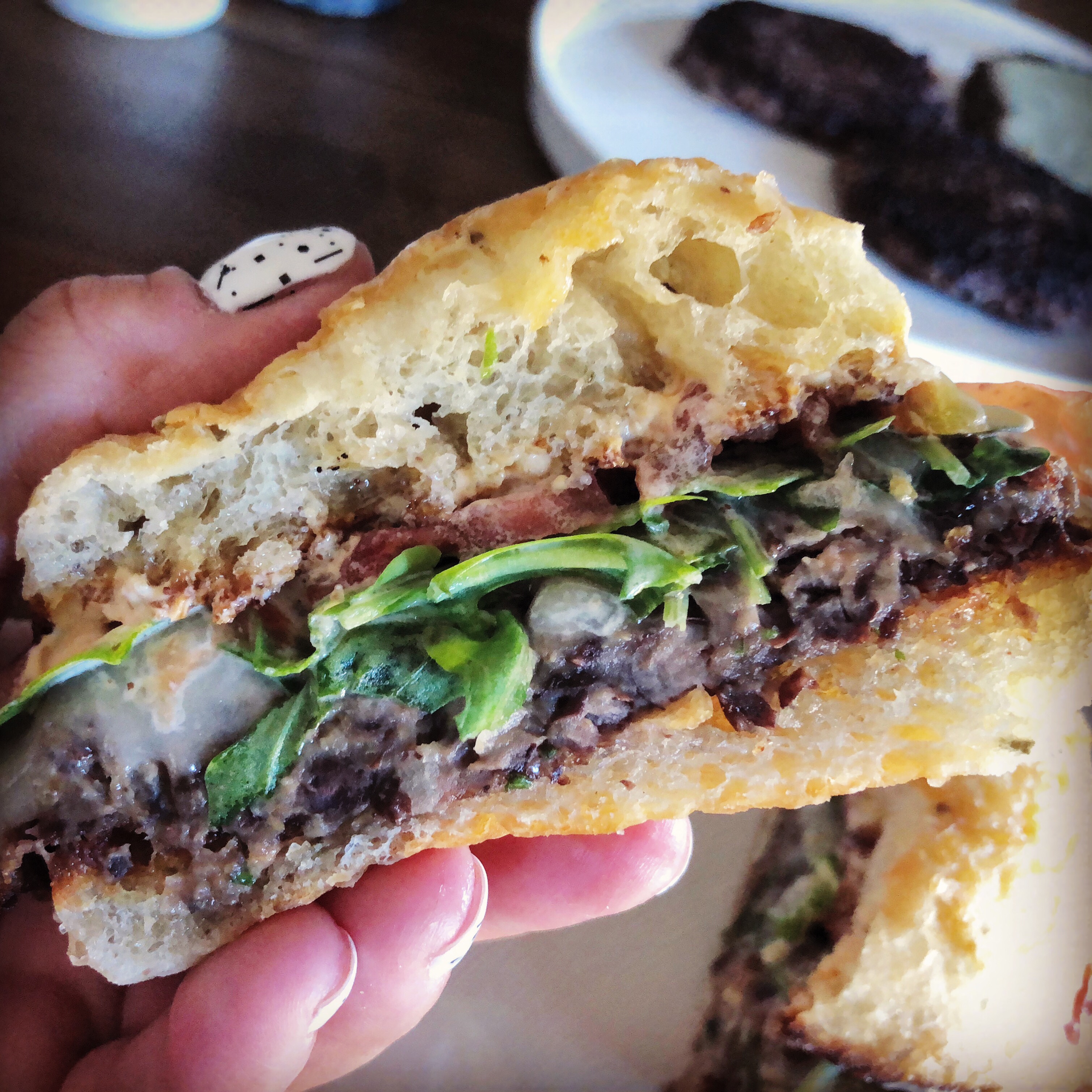 Both Sis and I said our minds couldn’t reconcile the look of a burger with the taste of black beans, etc. I kept thinking I was going to sink my teeth into a hamburger patty. Still, a tasty alternative.