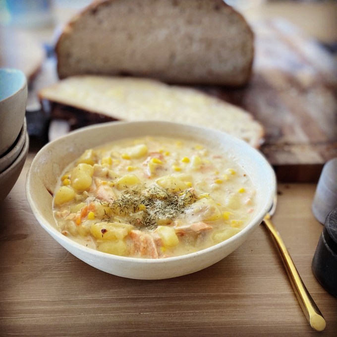 This chowder is chock full of chunks of potato, salmon and corn. And it’s still great with some crusty bread!
