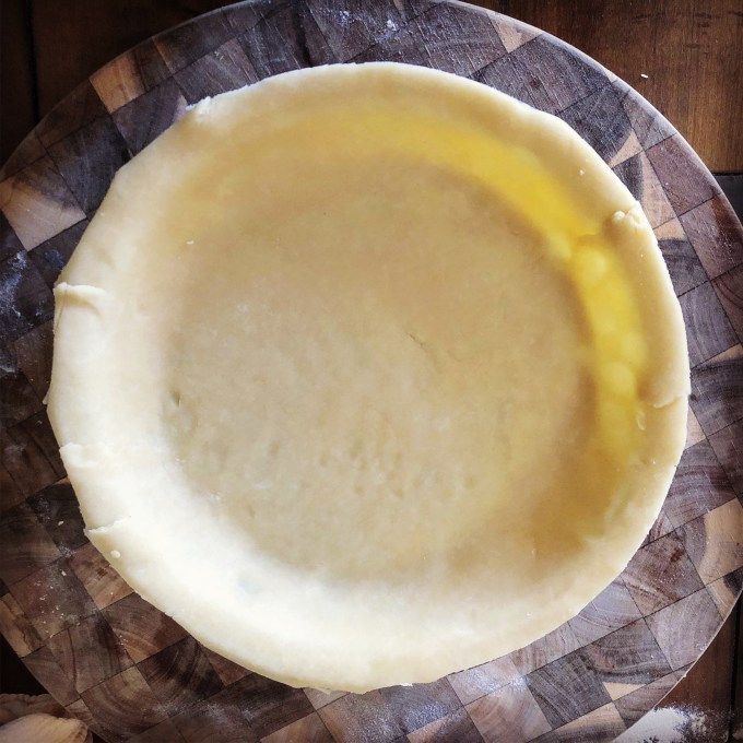 - Roll out dough using a rolling-pin. Try to work the dough from the center on out rolling evenly on each side and flipping often. The edges of the dough will be jagged. Try to keep it as round as possible but don’t obsess over the jagged edges. Add more flour to your surface or dough as needed. The rolled out dough for your pie crust should be 11 or 12 inches in diameter or about two inches larger than the ends of the pie pan. If you have problems placing the dough in the pie pan, try rolling the dough onto the rolling-pin and then unrolling over the pie pan.