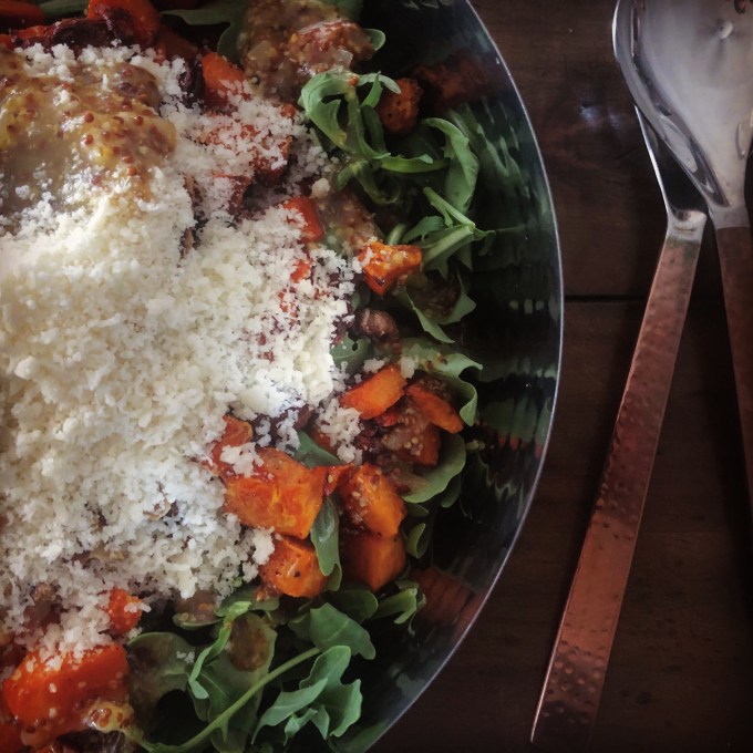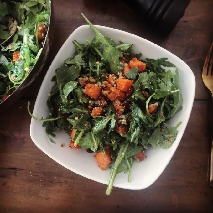 - Place the arugula in a large salad bowl and add the roasted sweet potato mixture, the walnuts, and the grated Parmesan. Spoon just enough vinaigrette over the salad to moisten and toss well. Sprinkle with salt and pepper and serve immediately.