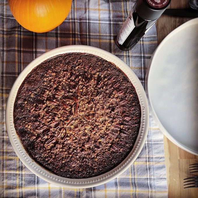 I would recommend using a 10-inch pie dish for this pie. I used a nine-inch pie dish and had massive amounts of sweet potato mixture left over (though, in truth, I didn’t really measure how much sweet potato I was putting into my mixer) as well as a small amount of pecan pie mixture. I would say you could probably cut the sweet potato mixture ingredients by half if you’re using a 9-inch pie plate.