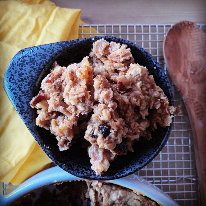 When making a baked oatmeal, the result is extremely dry – though, oddly, it’s not dry in a bad way. It almost reminds me of cooked granola. I’m not someone who likes dry baked goods. I like underdone cookies and super moist cakes and brownies. So it’s somewhat surprising to me that this dish actually tastes fine ‘dry.’
