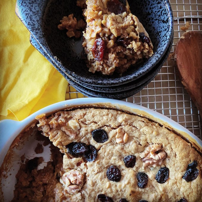 I love to make and eat baked oatmeal. Especially in the winter. It’s easy to make on a Sunday and reheat the rest of the week while at work. I got the idea for this combination of oatmeal ingredients in part by observing my coworker eating dried cranberries with peanut butter at her desk. At least I think that’s what she was eating; I wasn’t peering over her shoulder as she ate.