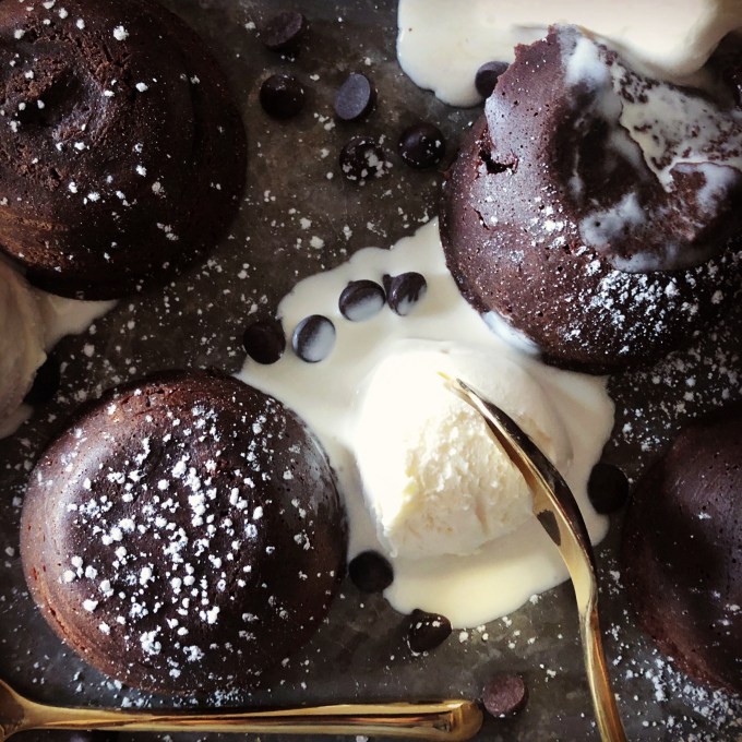 - When cakes are done, remove from oven and let stand one minute. Run knife around sides to loosen then turn them out onto a plate or shallow bowl. Sift powdered sugar over the cake and serve with a small scoop of vanilla bean ice-cream.
