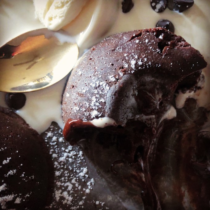 This cake literally melts in your mouth. The inside is a warm, buttery, chocolate lava. Delicious. Dad says the vanilla bean ice-cream cuts the sweetness of the dessert. I just think any cake tastes better accompanied by a scoop of ice-cream!