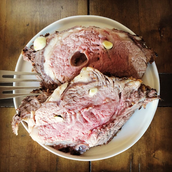 - Shove garlic cloves into the meat on either side. I tried to put the cloves beneath the fat, next to the meat but realized it worked better to shove the cloves into the meat wherever I could fit it. You should shove it in as deep as possible or it will pop out while roasting. Most of mine did!