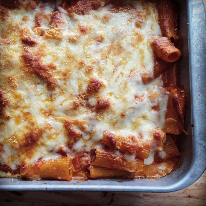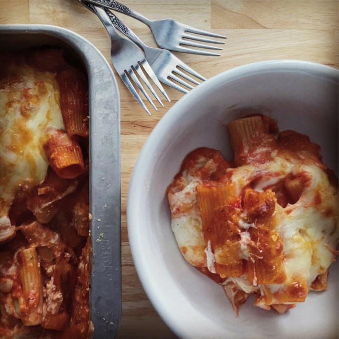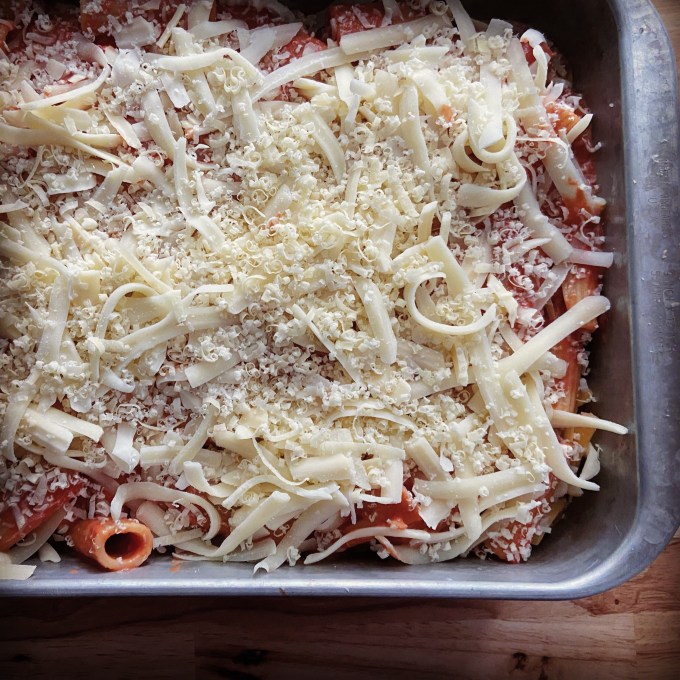 We baked this dish 35 minutes. I was in control of the timer and erred on longer time instead of shorter. The cheese topping turned out perfectly crisp (as we all like it). The only thing I would change would be to have a thinner sauce. Although the pasta bake wasn’t dry, it could have been a bit saucier. Perhaps knocking 10 minutes off the bake time would fix that problem as well.