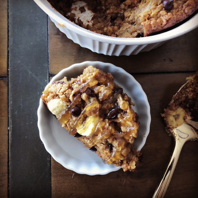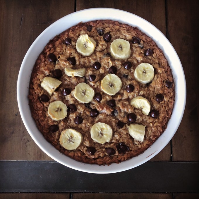 Chunks of banana, milk chocolate chips and peanut butter. For breakfast? Who says you can’t eat dessert for breakfast?