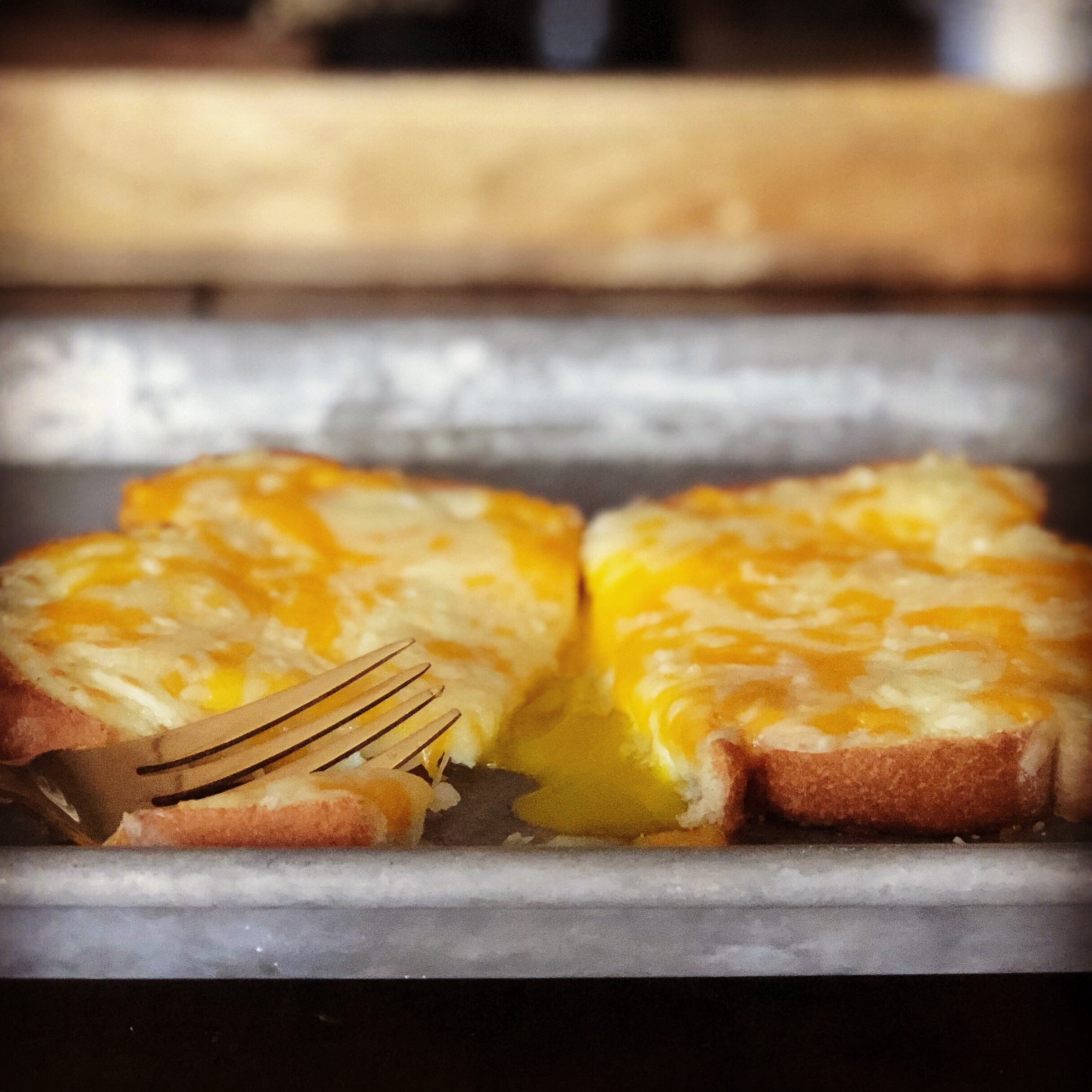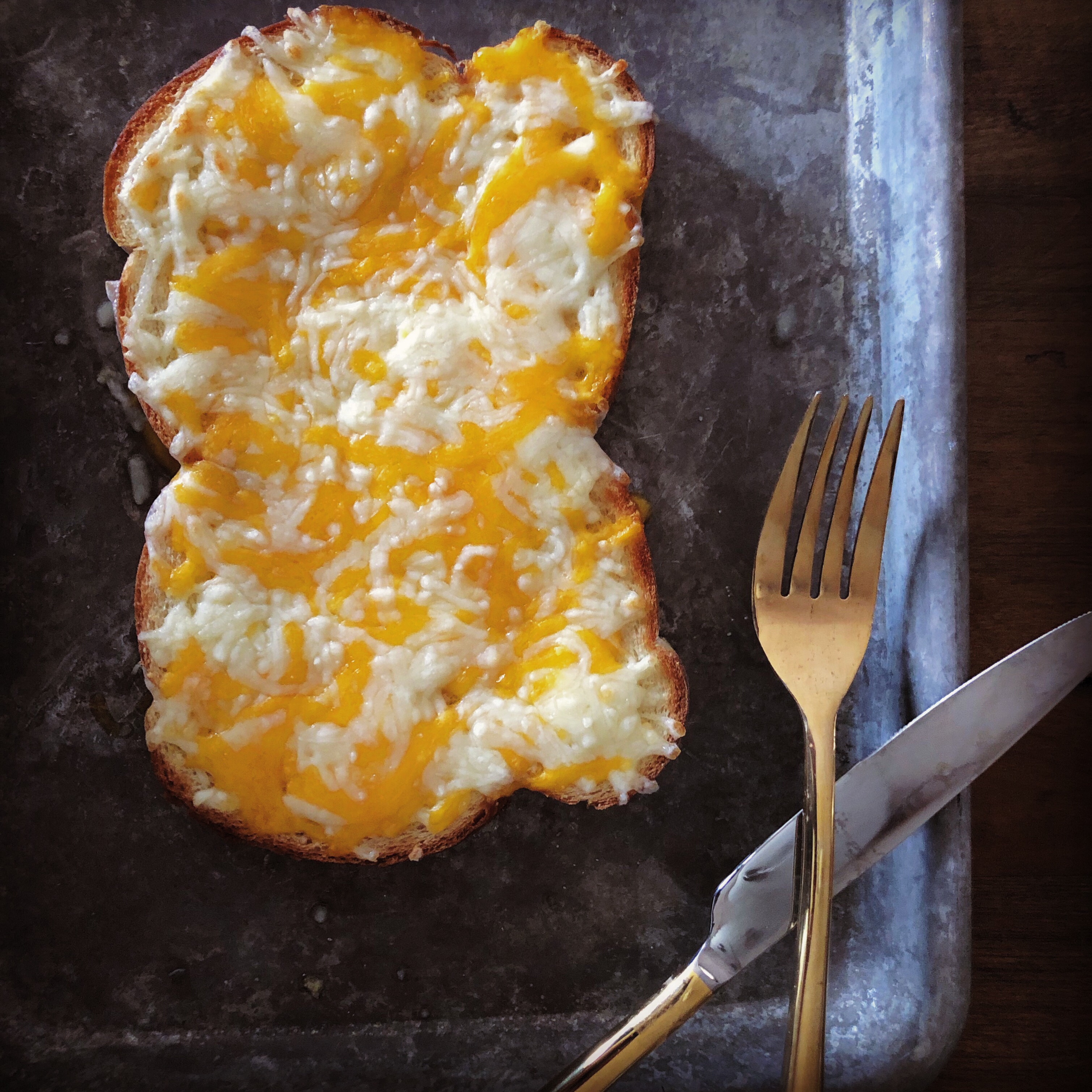 - Remove brioche slices from griddle and set on cookie sheet. Distribute grated cheddar evenly over slices, covering from corner to corner (any exposed areas will burn under the broiler).
