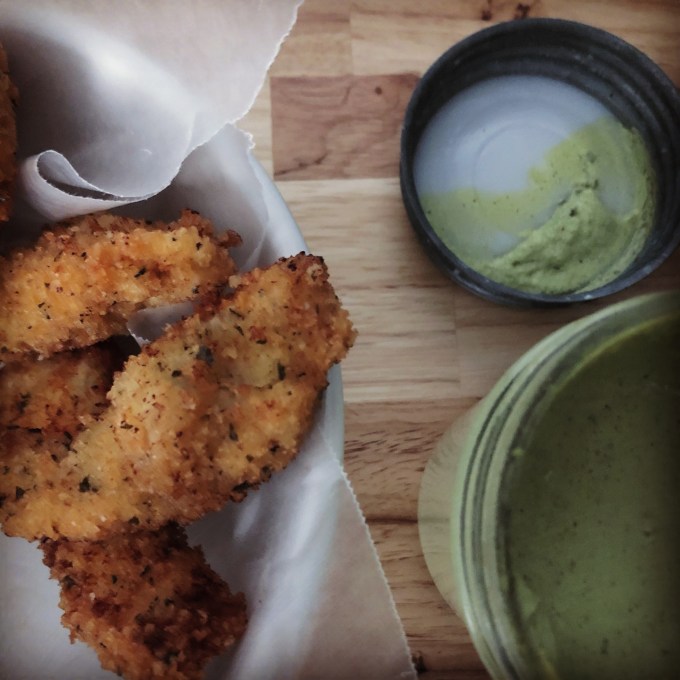 This is probably common sense, but the bigger the size of your chicken strip, the more time it will need in the oil. I found that small pieces were done in a minute and the larger pieces were done in two or three. Any more than that and your chicken will be too well done/no longer juicy.