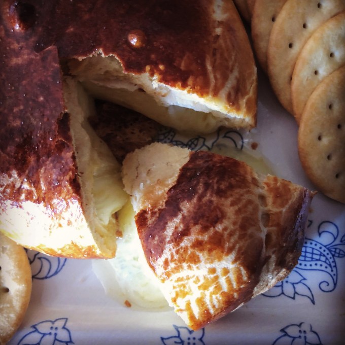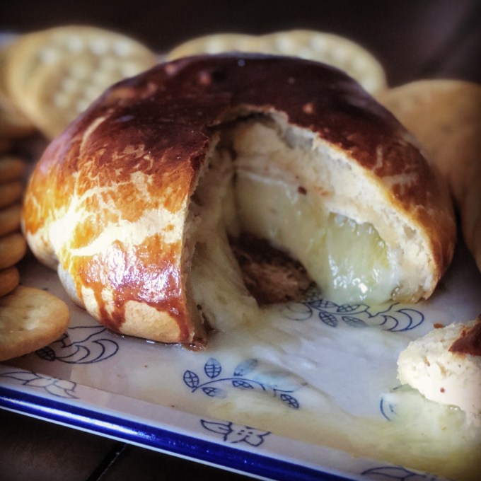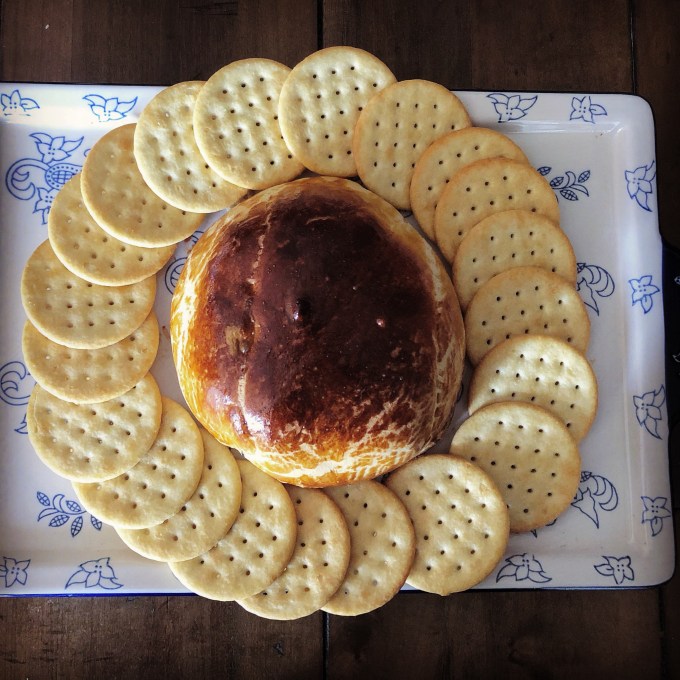 I usually serve this appetizer with thin crackers (water crackers or other varieties) and slices of apple wedges (for those that can’t eat/don’t like crackers). I do think you could eat this with a fork (sans accompaniments such as crackers or apple wedges) – the crust is that good.