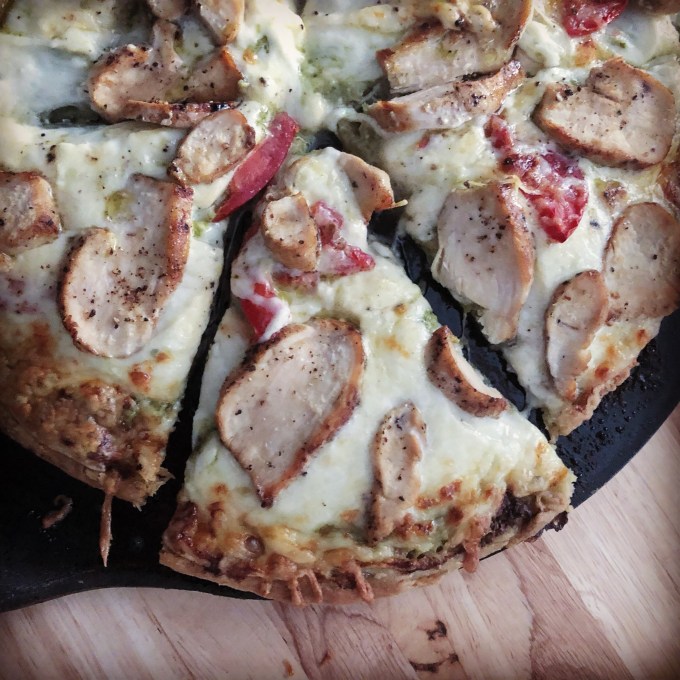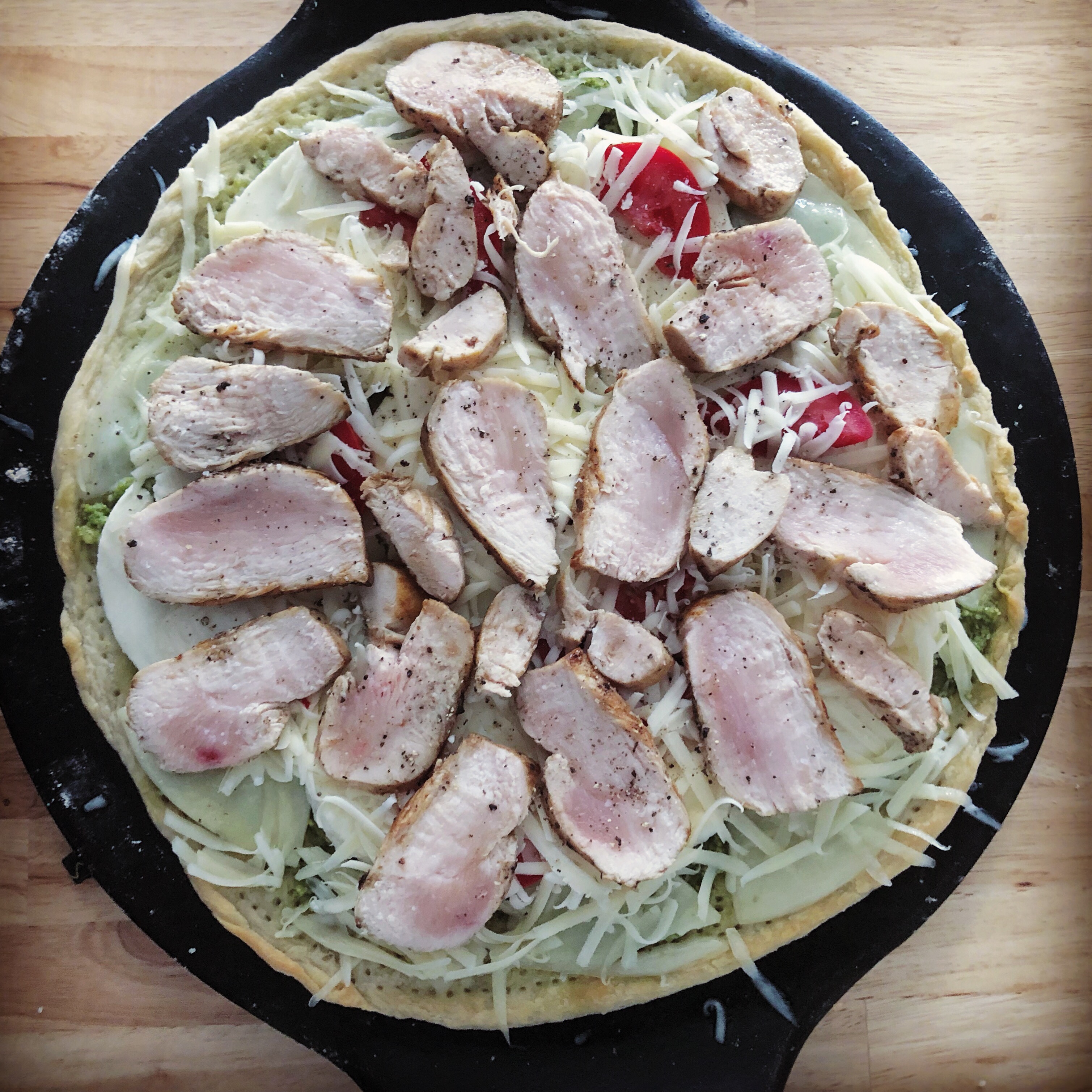 - Remove from oven and cover the crust with pesto, cheeses, tomato and uncooked chicken. Season with salt and pepper.