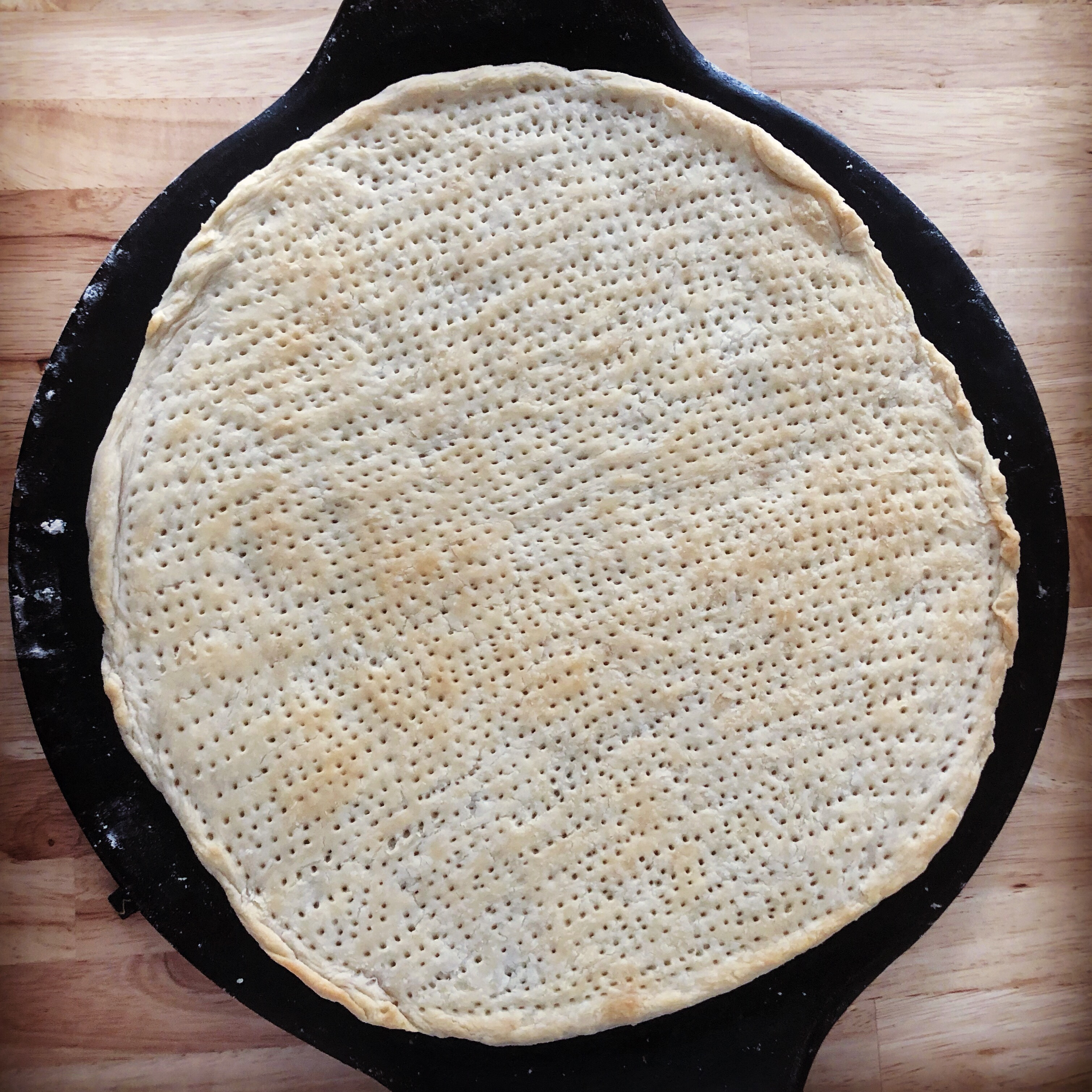 - Roll out to about 15 or 16-inch diameter and place on pizza pan or pizza stone. Try to make the edges as uniform as possible. I used a small plastic food scraper with a sharp edge. Poke holes all over your crust and bake for 10 to 15 minutes until crust starts to brown.