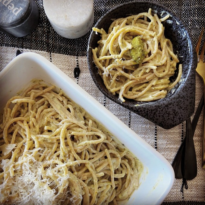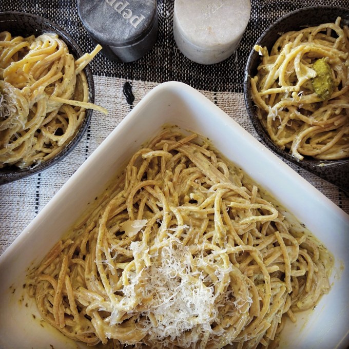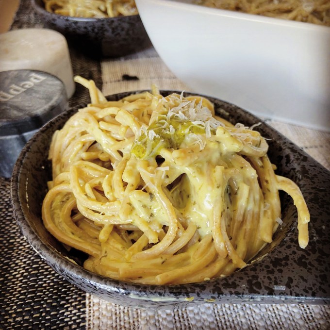 The browned butter alfredo would stand by itself. I was worried the combination of browned butter alfredo and pesto sauce would make a wonky combination, but I didn’t notice anything funky about the flavor. Unless the sauce tanks, I’m always going to love an alfredo or pesto sauce. So obviously I love the combination. The key is to adjust the sauce consistency to your liking with additional heavy cream – I always seem to need to add more!