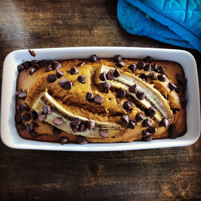 This is a great light bite to eat on Thanksgiving morning when you know you’ll be overloading on turkey and stuffing later. There’s so much pumpkin/banana in this recipe I almost think you could bake the crap out of these loaves and they would still be moist. This bread was so moist/dense it almost seemed bread-like in consistency.